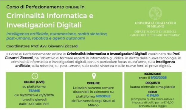 Ancora una decina di giorni per iscriversi al corso di perfezionamento che non può mancare nel bagaglio di tecnici, giuristi, DPO, consulenti privacy ed esperti di nuove tecnologie: il corso online di “Criminalità Informatica e Investigazioni Digitali”, dell’ Università degli Studi di Milano inizia infatti il 16 febbraio 2026 e dura fino al 26 marzo 2026, ma se volete iscrivervi c’è tempo solo fino al 9 febbraio.