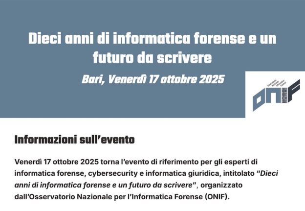 Venerdì 17 ottobre 2025 si terrà a Bari, nella splendida cornice di Villa De Grecis, Bari, la 9a edizione dell’evento annuale dell’Osservatorio Nazionale d’Informatica Forense (ONIF) dedicato a Operatori delle Forze dell’Ordine, Giuristi e consulenti tecnici e Personalità istituzionali e professionisti del settore informatico forense.