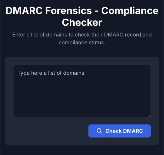 Il DMARC Forensics – Compliance Checker è uno strumento web gratuito e avanzato, progettato per analizzare la configurazione DMARC (Domain-based Message Authentication, Reporting, and Conformance) di uno o più domini. Creato per essere semplice, veloce e sicuro, il tool opera interamente lato client, garantendo che nessun dato inserito dall’utente venga trasmesso o memorizzato su server esterni, nel pieno rispetto della privacy.